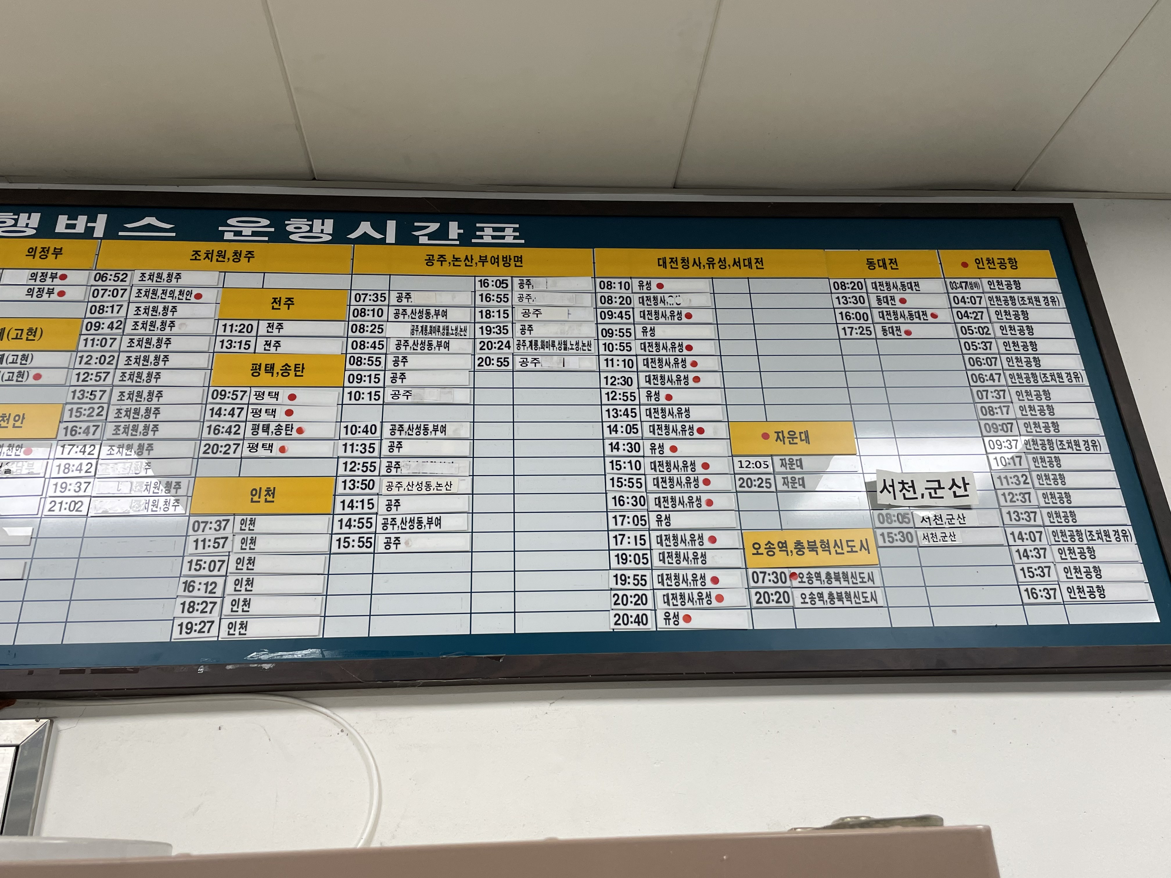아무래도 세종시 남쪽에 본 터미널이 따로 있는데다 북쪽으로 가는 길이어서 그런지 대부분의 버스가 중부 지방으로 향하는 버스들이었다. 게다가 결행도 많고....