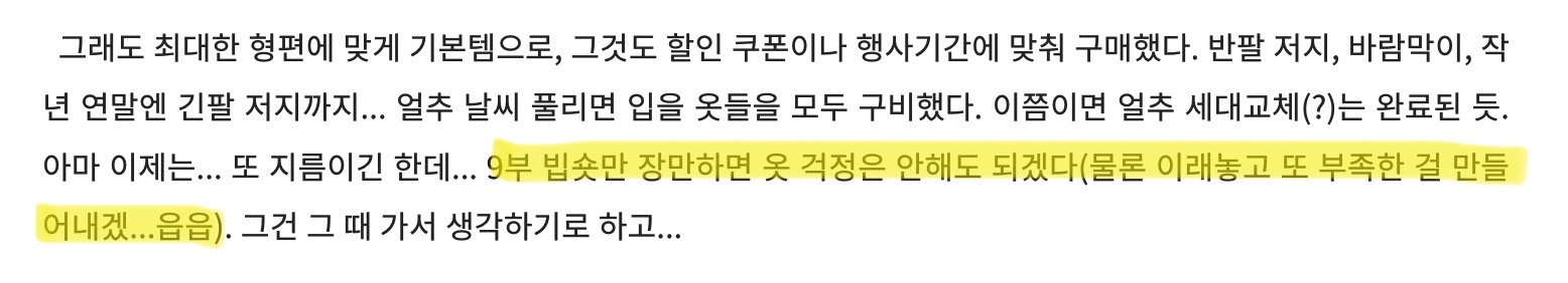 그렇게 춘추복까지 모두 세팅했다. 더 살 것을 찾아낼 순 있겠지만, 여기만 투자할 게 아닌 이상 이만하면 됐다. 이제부턴 사는 것보다 타는 것에 집중해야지. 따뜻한 옷도 샀으니 봄가을에도 거림낌없이 자전거 타러 다녀야지..!