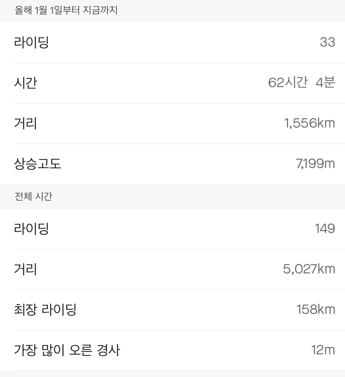 원래 수영 기록까지 한꺼번에 쓸까 했는데, 글이 너무 길어져서 따로 써야겠네. 아무쪼록 라이딩 기록 하나하나 읽어주셔서 감사하고, 앞으로도 계속 안전라이딩 하겠다!! 마지막으로 올해까지의 기록 캡쳐와 함께 글을 마무리하겠다. 머지않은 시일 내에 수영 이야기도 하러 올 테니 기다려주시길!!