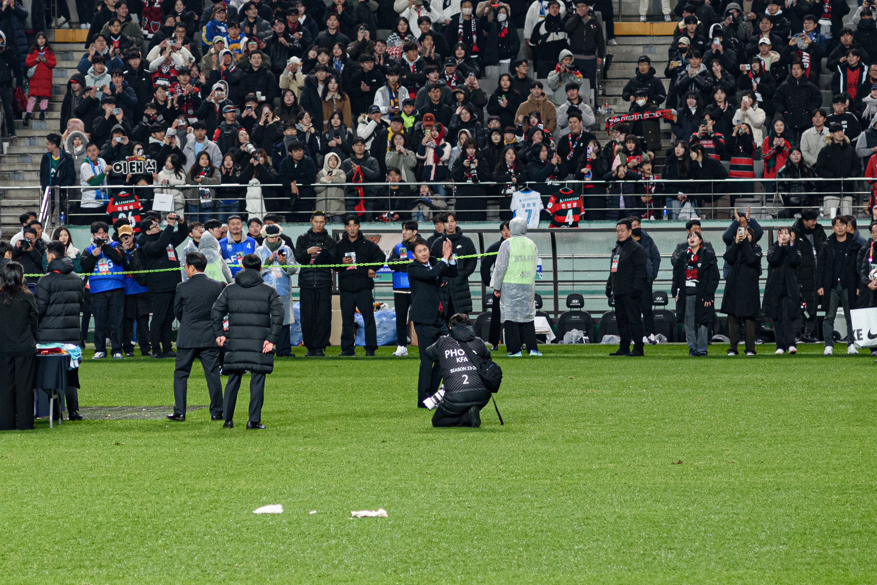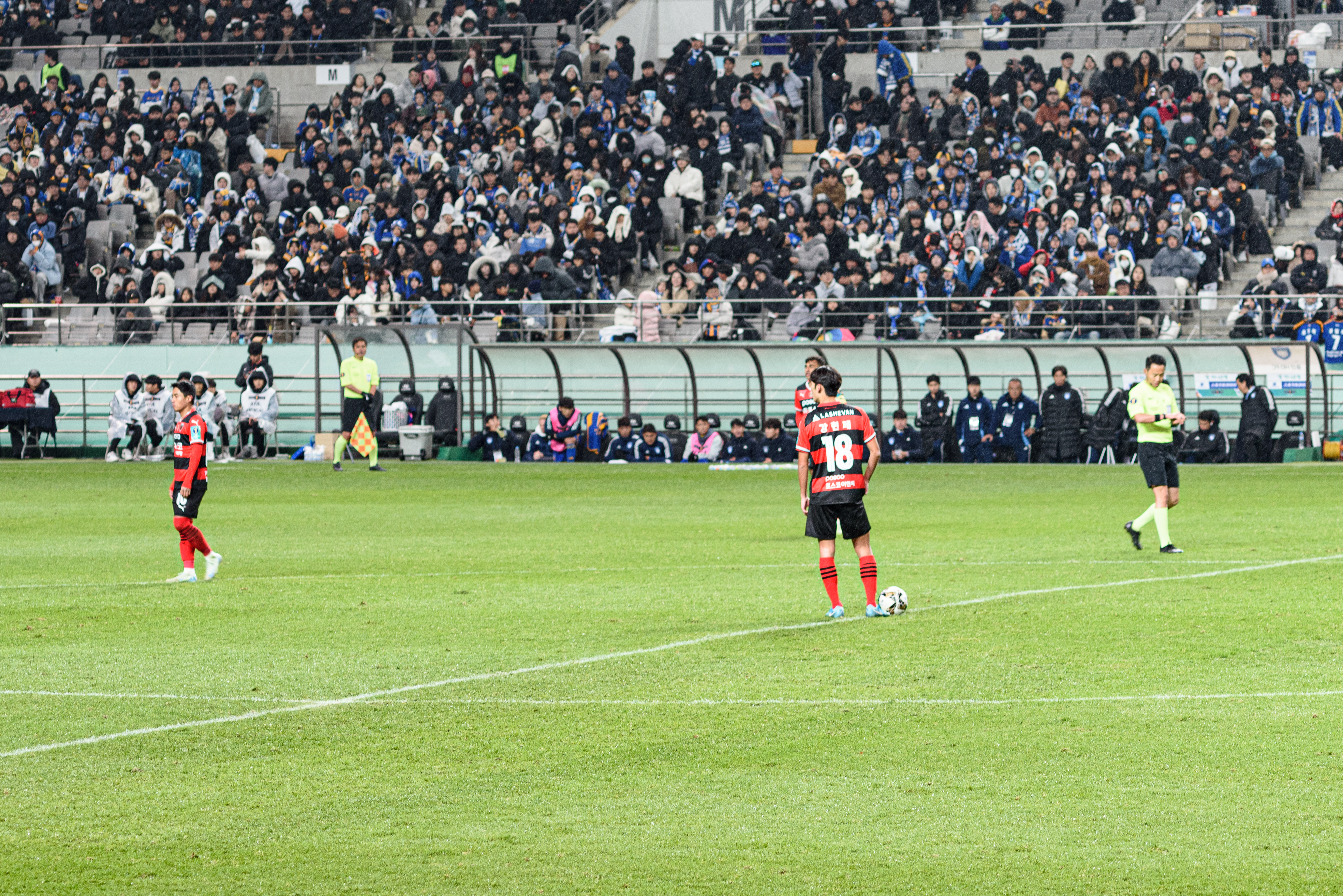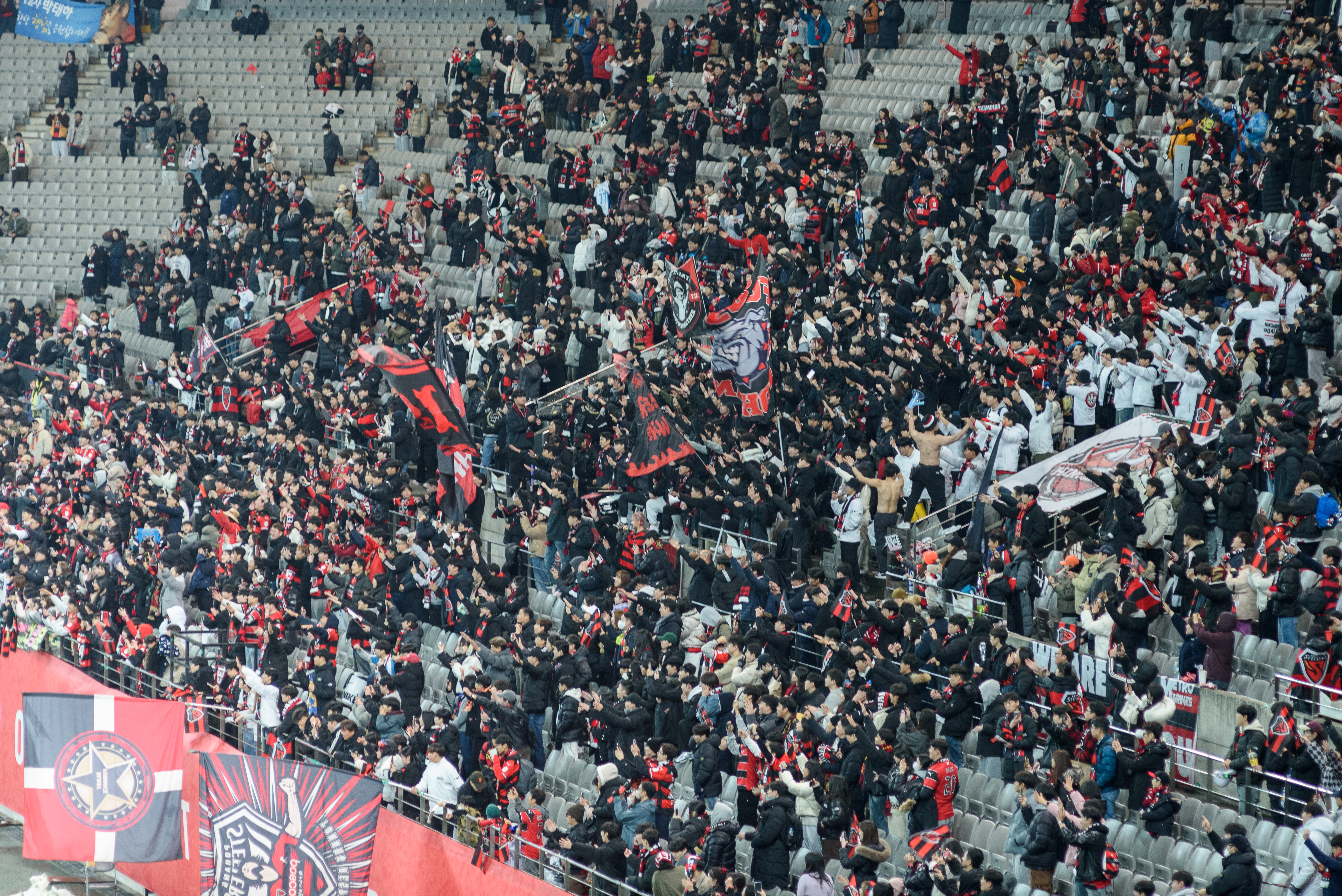 와, 사람 정말 많이 왔더라. 포항은 N석을 이미 가득 채웠고, 울산도 응원석이 빽빽히 들어찼더라(눈 때문에 절반 정도를 못 앉게 해서 좀 휑해 보이긴 했으나..). 이 날 공식 관중수가 27,138명인가 그랬는데, 양 쪽이 모두 서포터들로 빽빽이 들어찬 데다 둘 다 어디 가서 응원콜로 밀리는 팀들이 아니고, 상암 자체가 수용 관중수가 많은 구장이다 보니 정말.. 다른 경기와는 급이 다른 열기였다. 특히 우리 팀이 응원 준비를 엄청 잘해왔다는 게 체감됐다. 덕분에 약간 유럽 축구 경기를 직관하는 느낌을 받았고, 그 공기를 하나하나 카메라에 담았다.